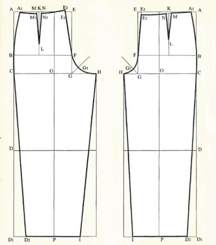 Проводим линию низа изделия по точкам D2 Р I и линию шагового шва по точкам Н I.