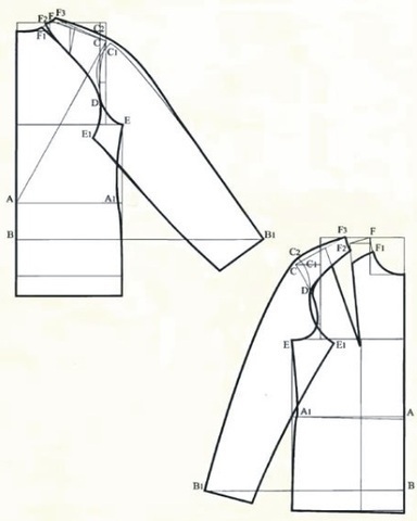 Проведем линии плеча и верхнего шва рукава по точкам F3 С 2 В1.